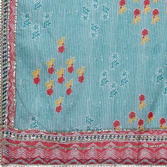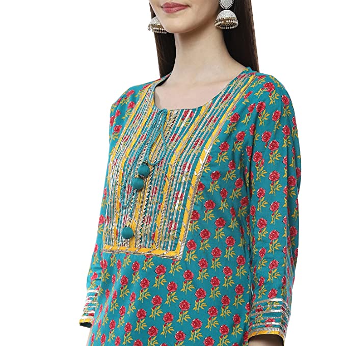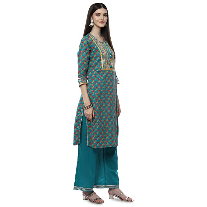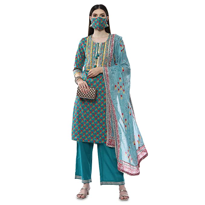 About this Item Colour : Teal Fabric : Cotton Wash Care : Wash Separately In Cold Water, Do Not Bleach, Dry In Shade, Medium To Hot Iron.,Made In India Package Includes : Kurta,Palazzo,Dupatta Department : Women Additional Information Item Weight200 g Item Dimensions LxWxH30 x 25 x 10 Centimeters Generic NameSuit Set