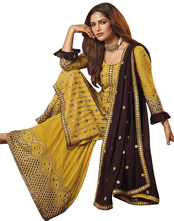 About this Item Top Fabric : Fox Georgette || Bottom Fabric : Fox Georgette || Duptta Fabric : Fox Georgette|| Inner Fabric : Creap Top Color : Yellow || Bottom Color : Yellow || Duptta Color : Brown|| Inner Color : Yellow Top Length : 41( Inch) ||Top Width Size : 44 ( Inch ) || Bottom Length : 1.85 MTR || Duptta Length : 2.25 MTR Top Work : Embroidery and Sequence work ||Bottom Work : Embroidery Sequence work || Duptta Work : Embroidery Sequence work || Sleeve Style : Full sleeve|| Neck Style : Round Neck Wash Care: Dry clean for the first wash, there after hand wash Additional Information Item Weight400 g Item Dimensions LxWxH35 x 31 x 4 Centimeters