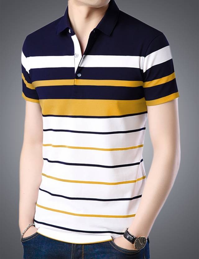Striped Men Polo Neck White, Blue, Yellow T-Shirt