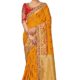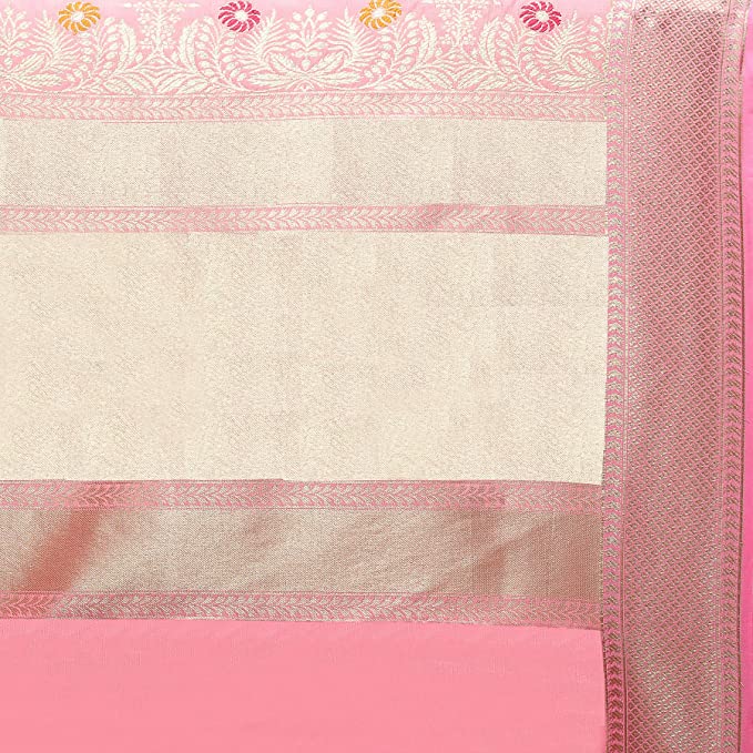 About this Item Saree Details: Saree Color- Baby Pink and Peach, Saree Fabric- Katan Silk, Saree Length- 5.5 m, Print- Floral Design, Work Type- Woven Zari Work Design Blouse Details: Blouse Color- Baby Pink and Peach, Blouse Fabric- Katan Silk, Blouse Length- 0.8 m, Print- Solid, Work Type- Solid With Zari Border Border and Pallu Details: Border Color- Golden and Peach, Border Work Type- Woven Self Design Zari Work Border; Pallu Color- Golden, Pallu Work Type- Woven Rich Brocade Zari Work Pallu With Tassels Wash Care: Dry Clean Only Weave Type: Kanchipuram; Included Contents: With Blouse Piece Additional Information Item Weight670 g Item Dimensions LxWxH5.5 x 1.16 Meters Net Quantity1.00 count Included ComponentsWith Blouse Piece Generic NameWomens Kanchipuram Silk Saree
