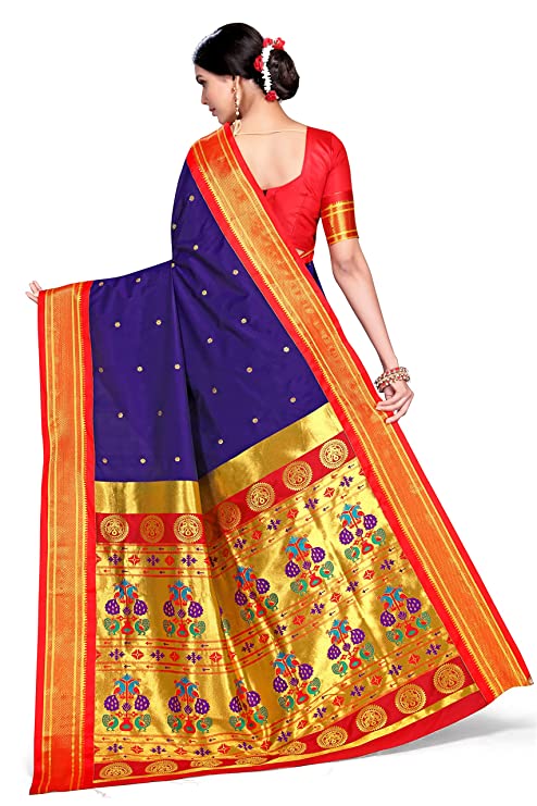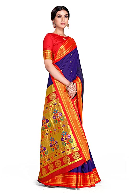 About this Item Saree Details – Saree Color: Indigo Blue | Material: 100% Soft Silk | Length: 6.3 m | Print: Woven | Work Type: Woven Zari Work Blouse Details – Blouse Color: Red | Material: 100% Soft Silk | Length: 0.8 m | Print: Woven | Work Type: Solid Blouse With Zari Border Border & Pallu Details- Border Color: Golden & Red | Border Work Type: Woven Temple Design Kadiyal Zari Border | Pallu Color: Golden & Red | Pallu Work Type: Woven Double Peacock Motifs Embossed On Brocade Zari Pallu Wash Care: Dry Clean For First Wash Then After Hand Wash Weave Type: Maharani Paithani Pallu With Kadiyal Border | Included Components: Saree With Unstitched Blouse Piece Additional Information Item Weight680 g Item Dimensions LxWxH5.5 x 1.16 Meters Net Quantity1.00 count Included ComponentsWith Blouse Piece Generic NameMaharani Pallu Kadiyal Paithani